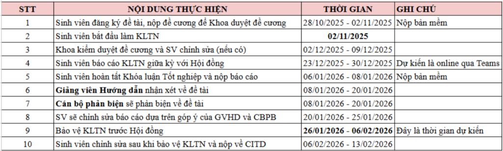 Phòng Đào tạo – Trung tâm Phát triển Công nghệ Thông tin (PĐT-CITD) thông báo đến Sinh viên đã đăng ký học phần Khóa luận Tốt nghiệp (IE505.F11.LT.CNTT) kế hoạch dự kiến thực hiện KLTN và thời gian đăng ký đề tài KLTN như sau: